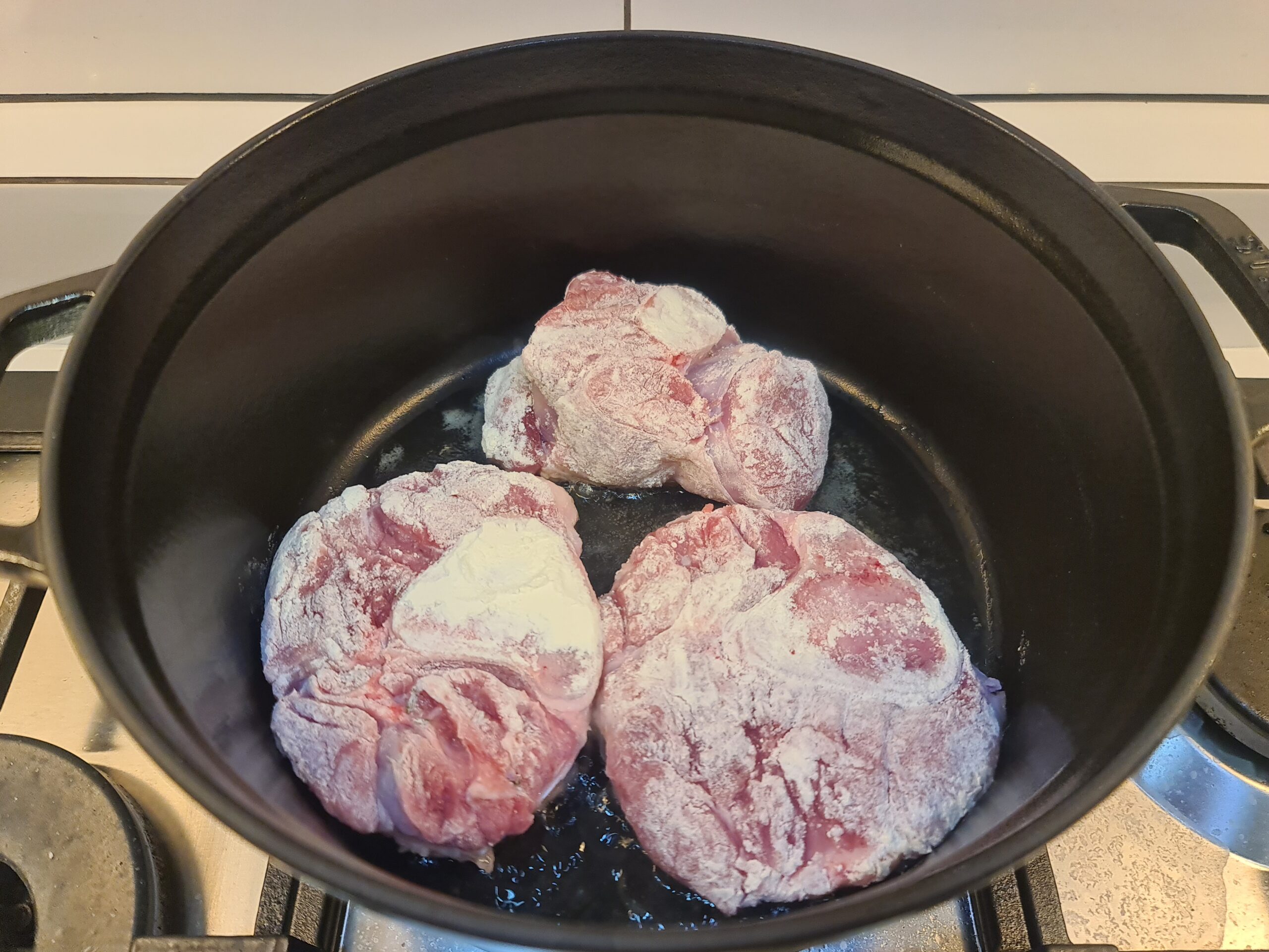 Farinez les morceaux de viande. Dans une cocotte, faites dorer chaque morceau de viande dans de l’huile, puis réservez. Faites attention à ne pas brûler la farine. Il est plus facile de faire dorer les morceaux de viande, 3 morceaux par 3 morceaux car la cocotte est un peu petite. N’hésitez pas à rajouter de l’huile si nécessaire. Encore une fois, attention à ne pas brûler la farine ! Une fois vos morceaux de viande bien dorés, sortez les de la cocotte et réservez les.