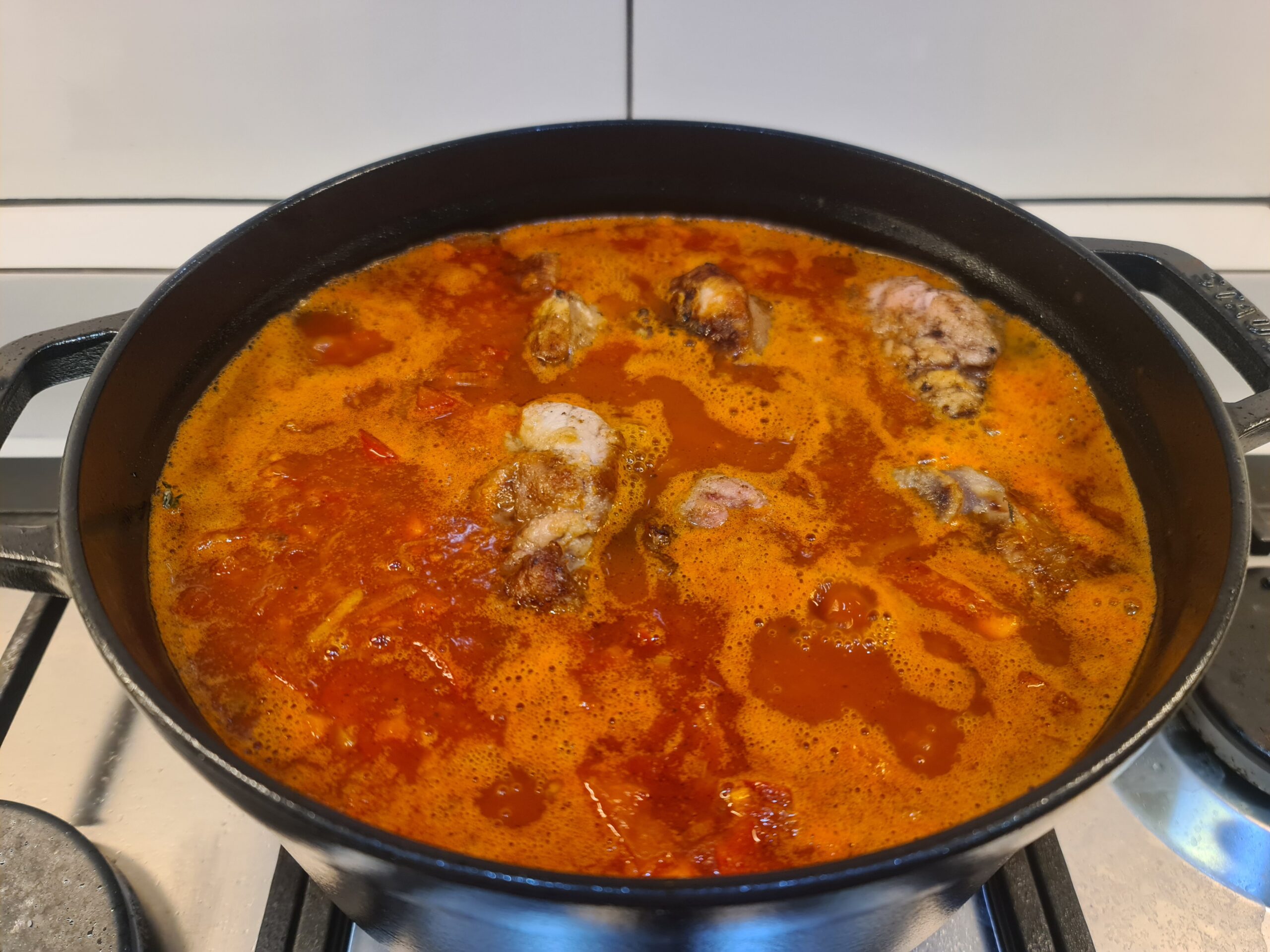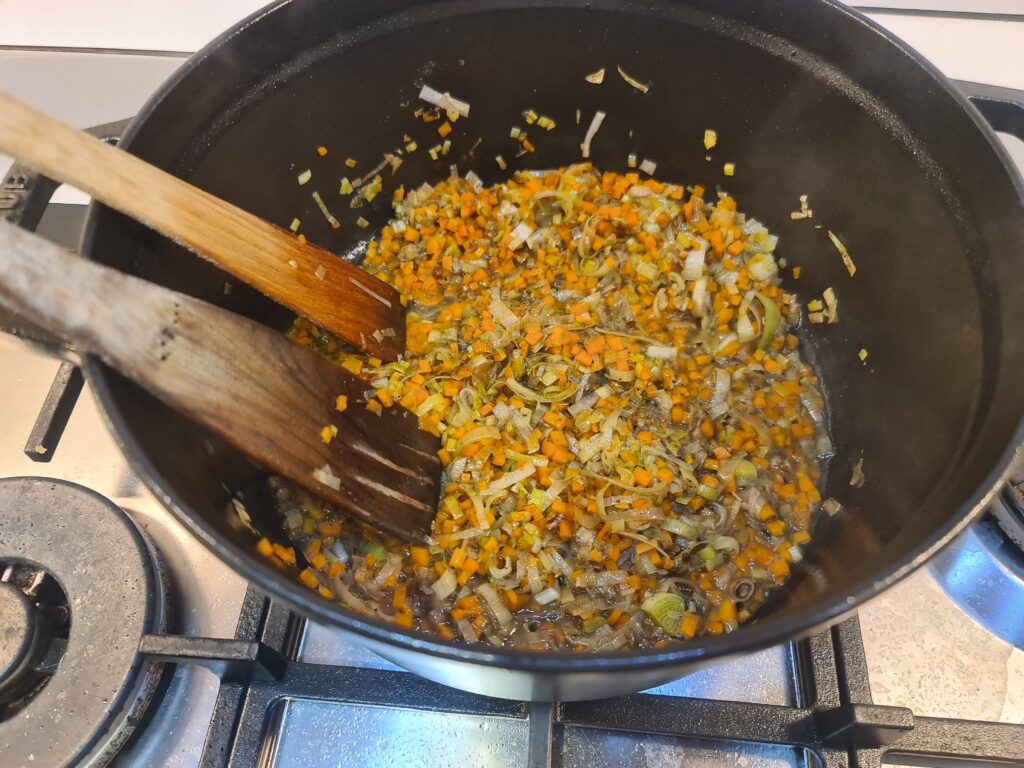 Remettez de l’huile d’olive et faites revenir le blanc de poireau finement émincé, une fois que le poireau est bien cuit, ajoutez les carottes finement émincées aussi. Une fois que les carottes ont un peu cuit, enlevez le pédoncule des tomates, coupez les finement et mettez toutes les tomates dans la cocotte, faites cuire encore un peu. Une fois que les tomates commence à se ratatiner, vous devez obtenir une sorte de grosse sauce assez liquide avec pleins de morceaux dedans. Ajoutez la bouteille entière de vin blanc. Remettre les morceaux de viande. Laissez cuire le temps de s’occuper des oranges.