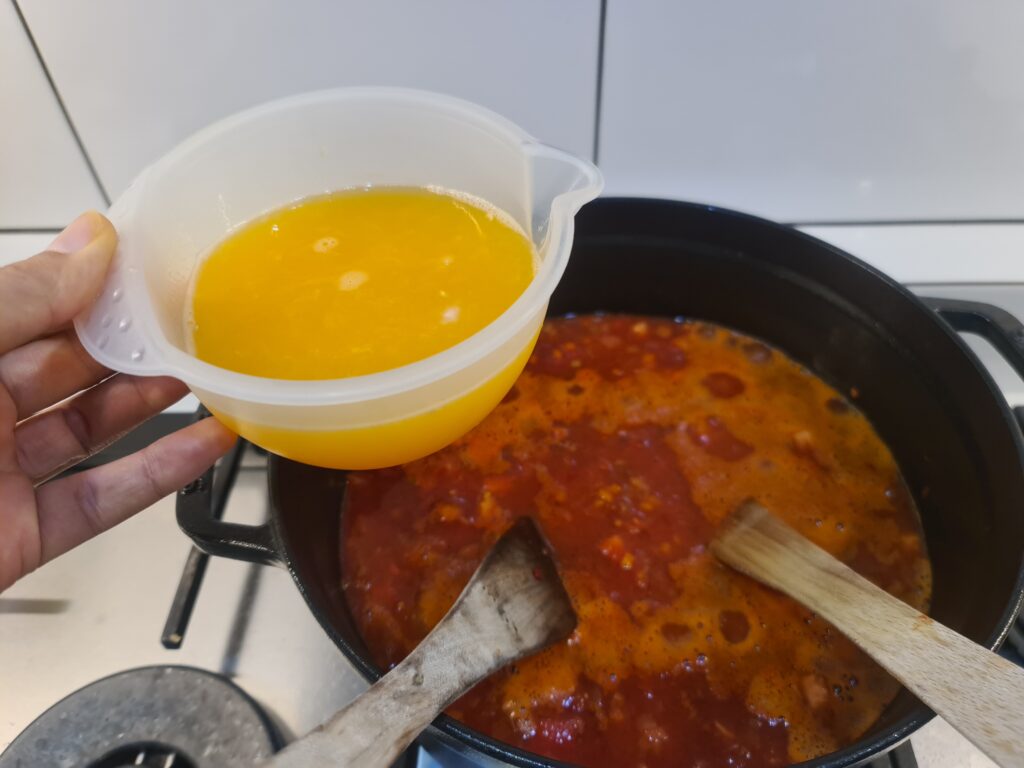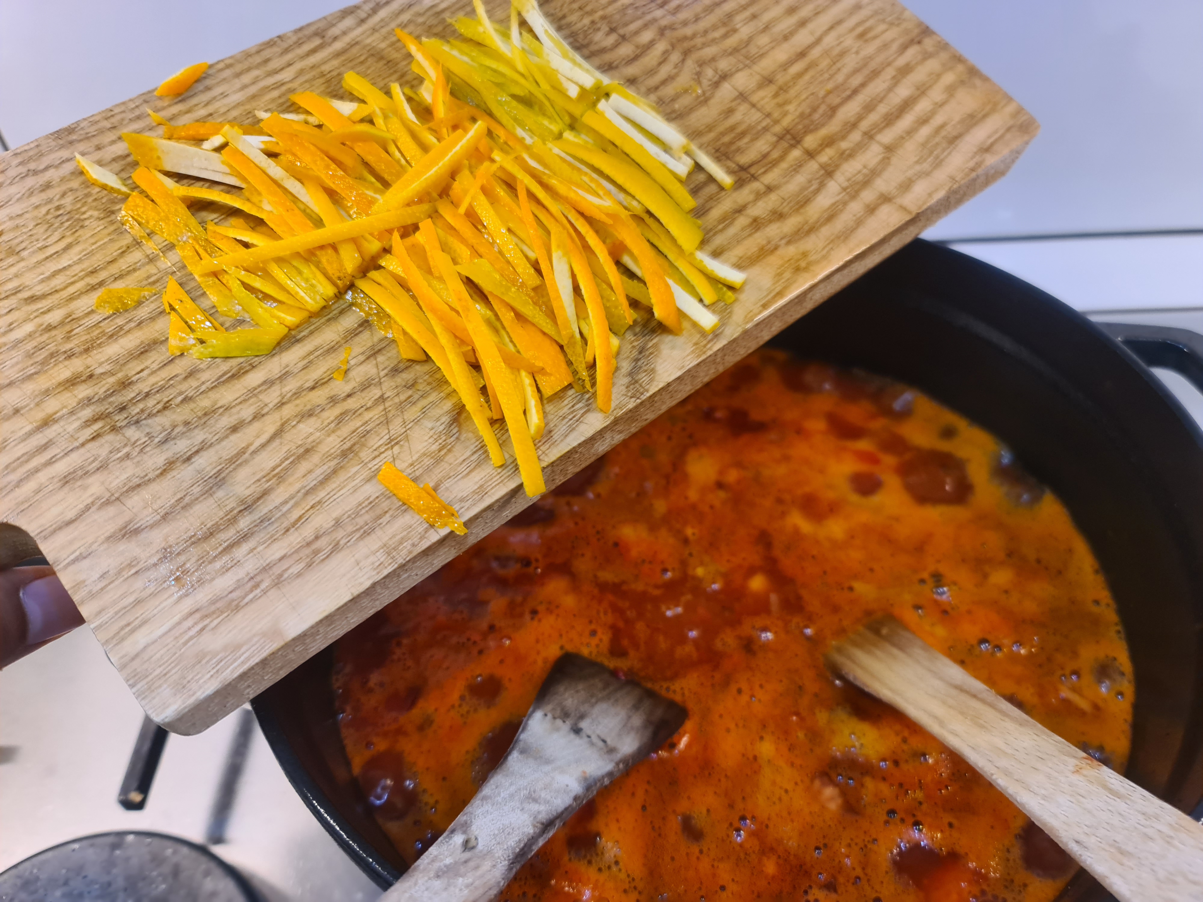 Lavez bien vos oranges biologiques, avec un épluche légumes, taillez de beaux zestes dans les oranges, bref pelez toute l’orange, évitez d’avoir du « blanc » avec vos zestes. Puis avec un presse orange – ou équivalent – pressez vos oranges et récupérez le jus et la pulpe – s’il n’y a pas trop de pépins -, mettez le jus, la pulpe et les zestes dans la cocotte, mélangez bien.