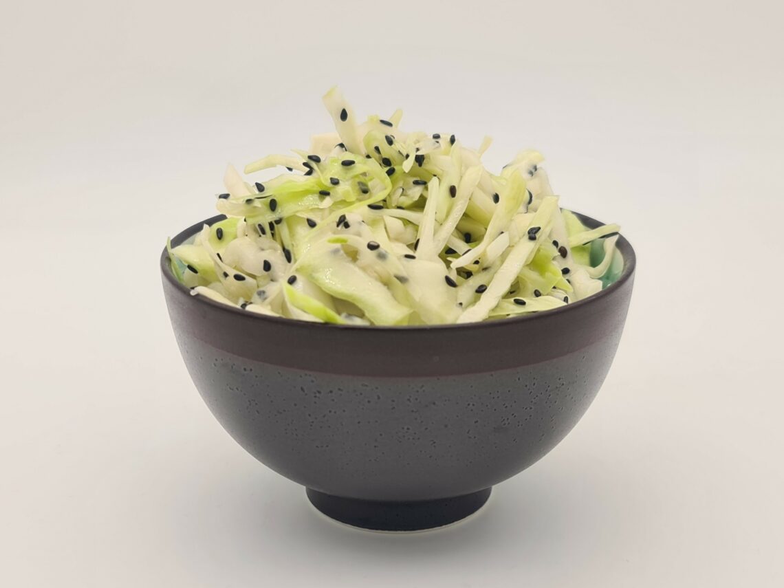 - Dans un bol, mélangez le vinaigre de riz, l’huile de sésame, le sucre roux, du sel et poivre selon votre goût