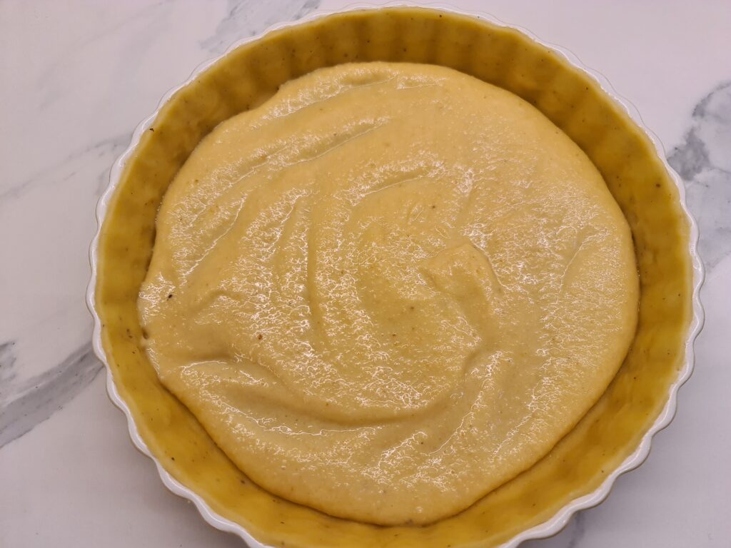 - Versez les 2 tiers de la crème d’amande dans la tarte, étalez bien
