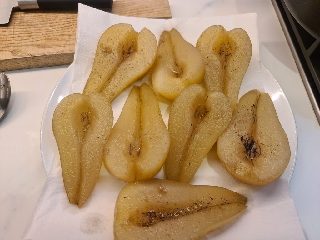 - Sortez vos poires de l’infusion, égouttez-les bien, séchez-les avec du papier absorbant