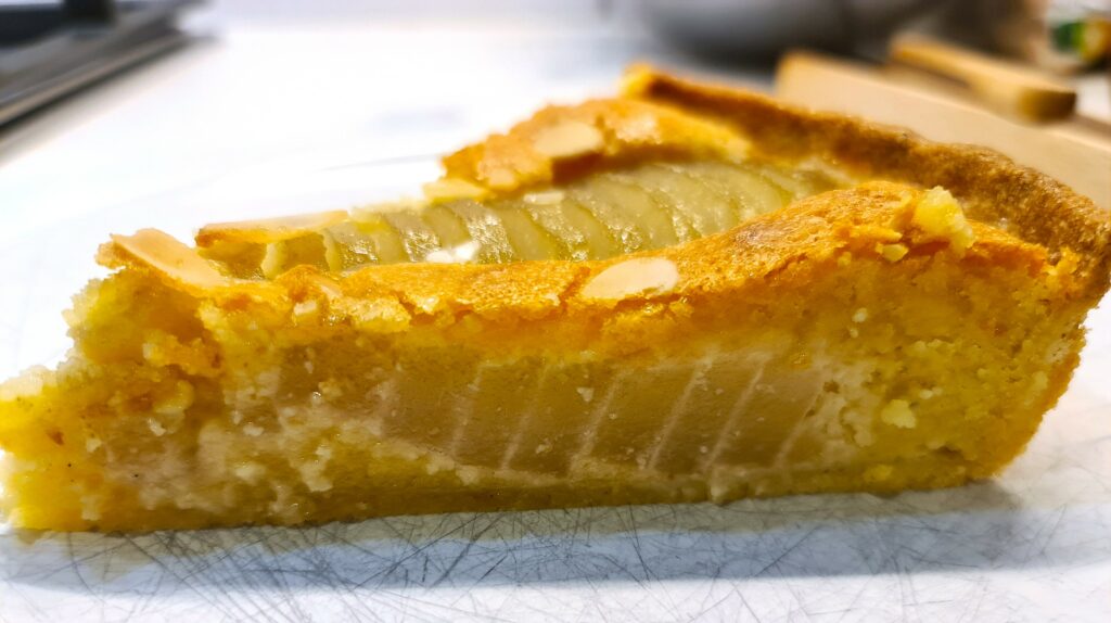 La recette est assez simple, un fond de tarte, une crème d’amande et des poires pochées, et zou, tout cela au four. Évidemment, si vous faites les poires pochées maison, cela va prendre un peu plus de temps.