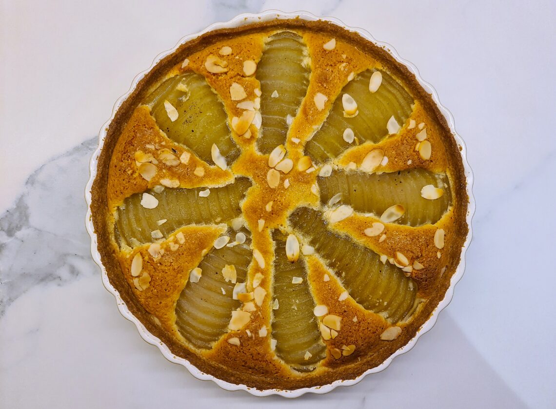 La recette est assez simple, un fond de tarte, une crème d’amande et des poires pochées, et zou, tout cela au four. Évidemment, si vous faites les poires pochées maison, cela va prendre un peu plus de temps.