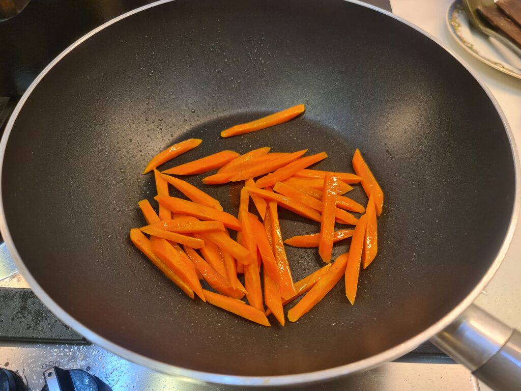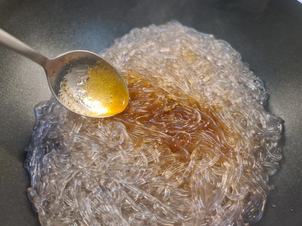 - Ajoutez la sauce pour le japchae et faites revenir à feu doux