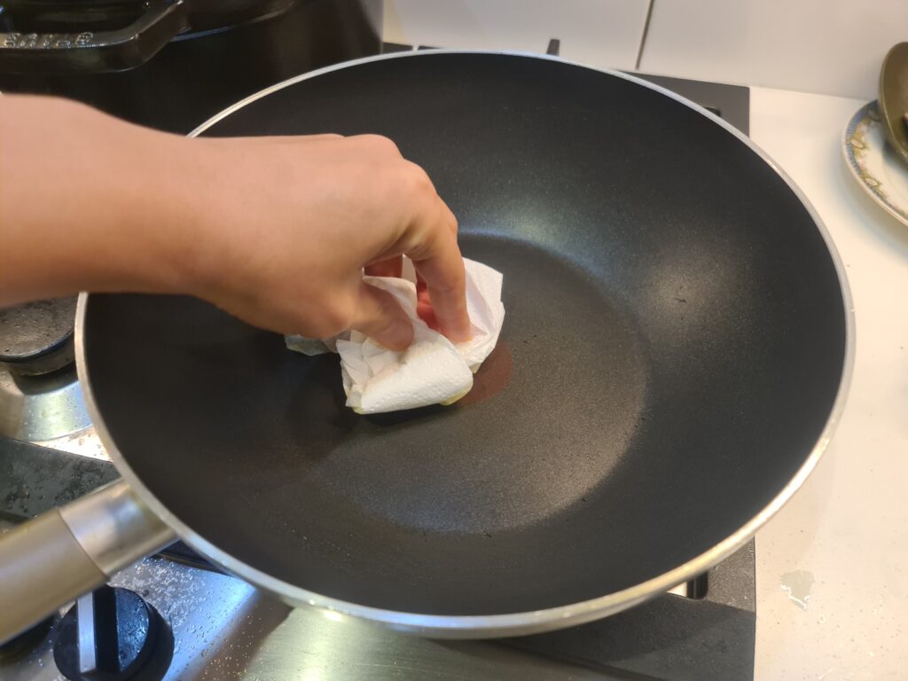 - 고기와 버섯, 당근을 볶은 뒤엔 키친타월에 기름을 묻혀 닦아주세요. 양념과 당근에서 나온 색이 다른 재료에 묻는 것을 방지합니다