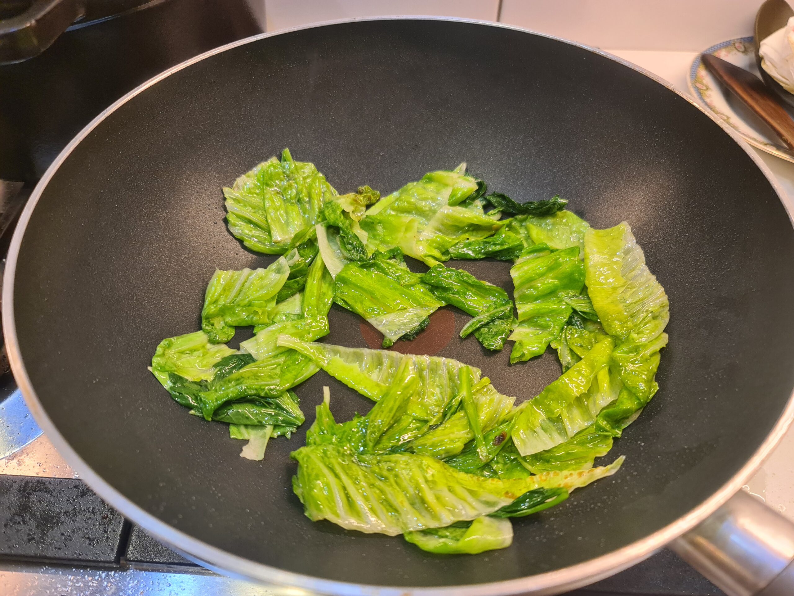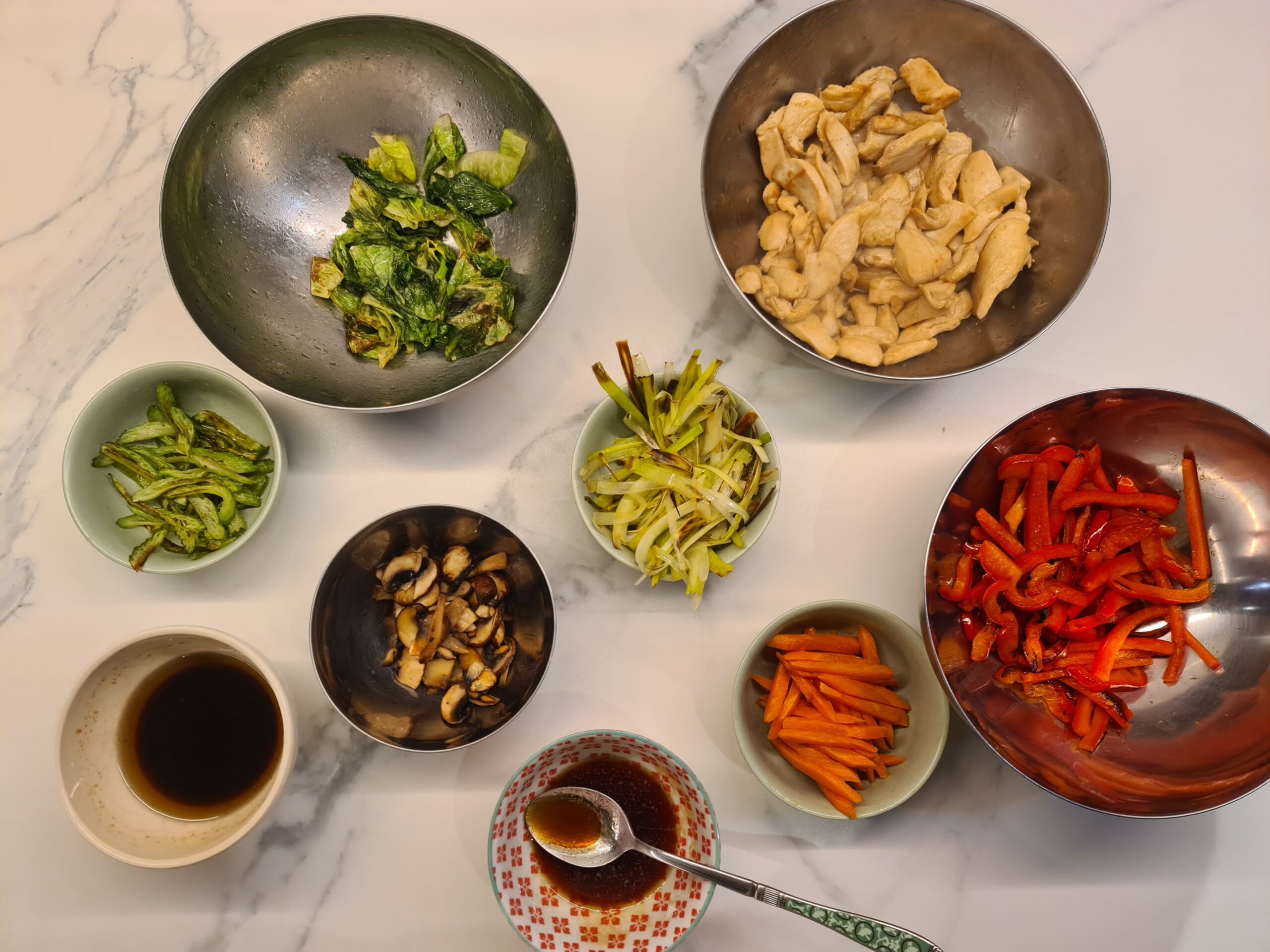 Vous verrez que, en ce qui me concerne, j’ai pris les légumes disponibles dans mon réfrigérateur. Pour les quantités, honnêtement, je les ai fait un peu au hasard. Je manquais d’épinards, alors je les ai remplacés par de la salade. J’ai rajouté du céleri-branches, les champignons shiitakes sont devenus des champignons de Paris et évidemment, n’aimant ni l’ail, ni l’oignon, je n’en ai pas mis. Alors, j’ai mis plus de poireaux pour compenser.