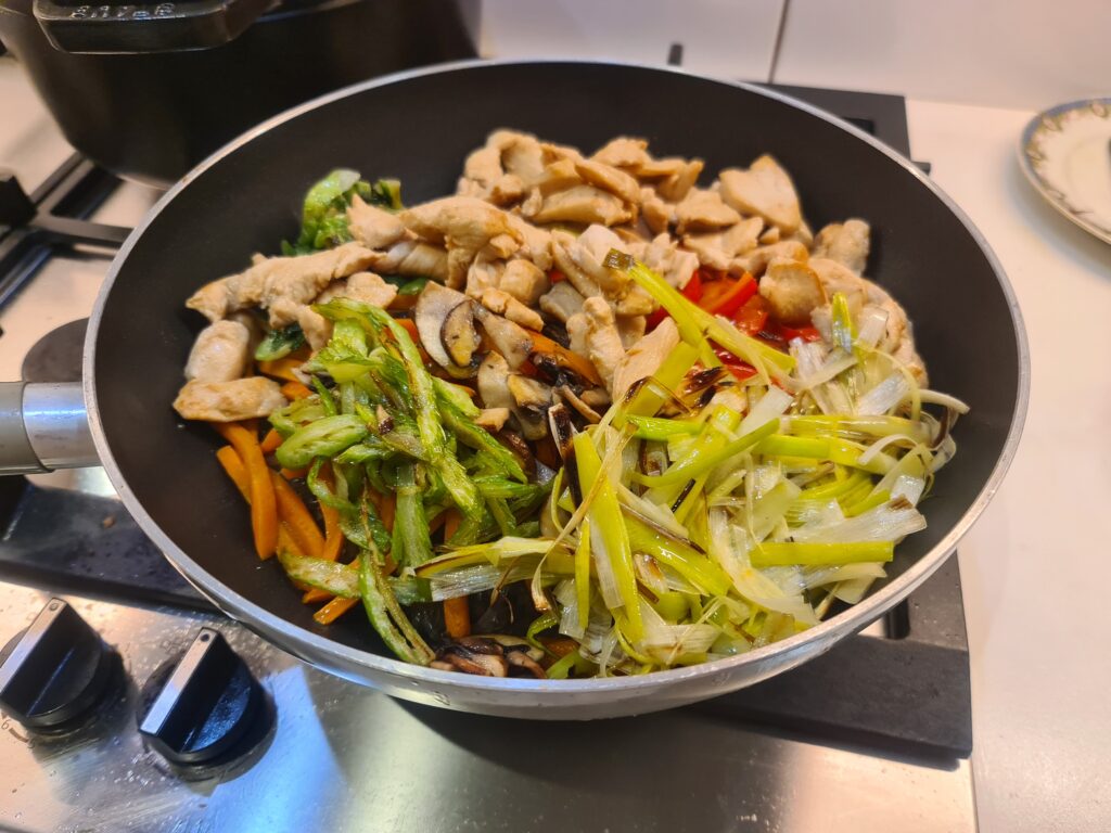 La recette n’est pas très compliquée, en revanche, elle est assez longue à faire puisqu’il faut faire cuire les légumes séparément et tout découper prend longtemps aussi.