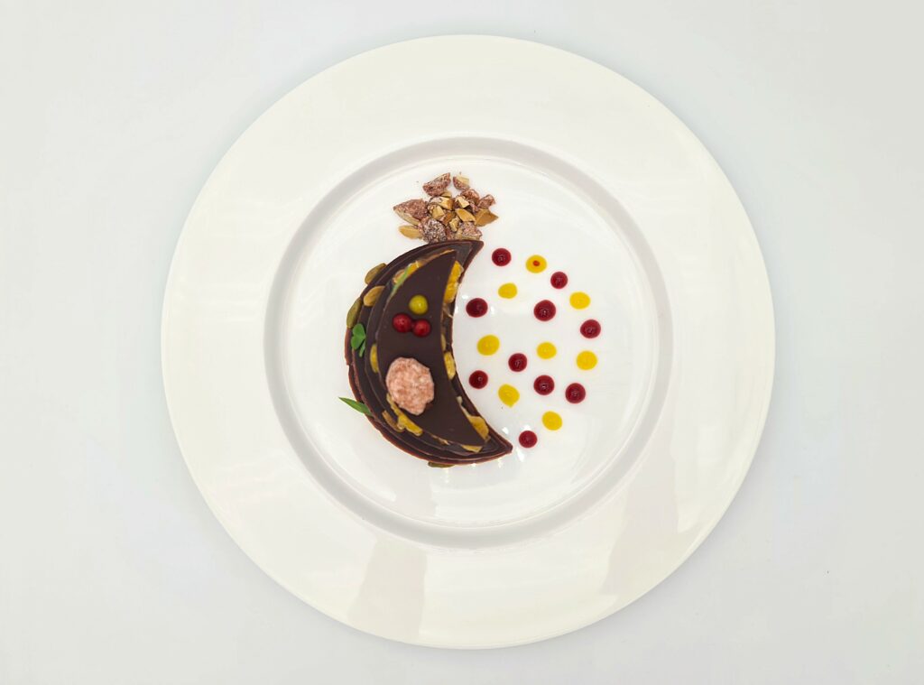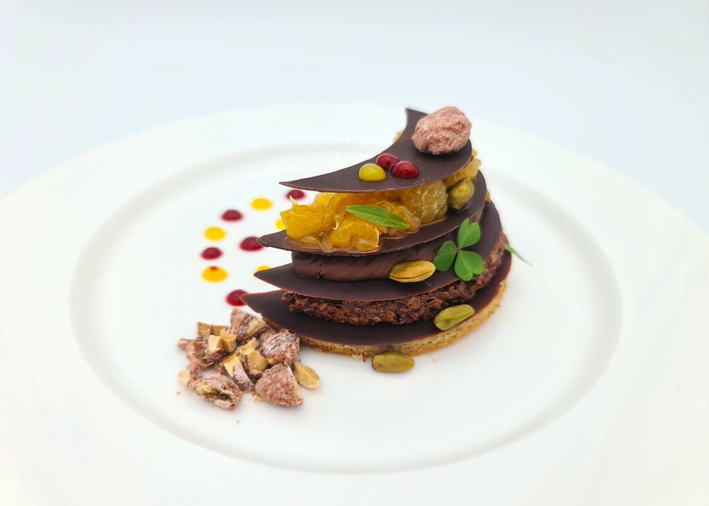 En dessert, j’ai fait un dessert à l’assiette qui n’a pas vraiment de nom, c’est une sorte de tour en chocolat, avec un chiffon cake sans produit laitier, un croustillant, une ganache chocolat noir et des clémentines fraiches.