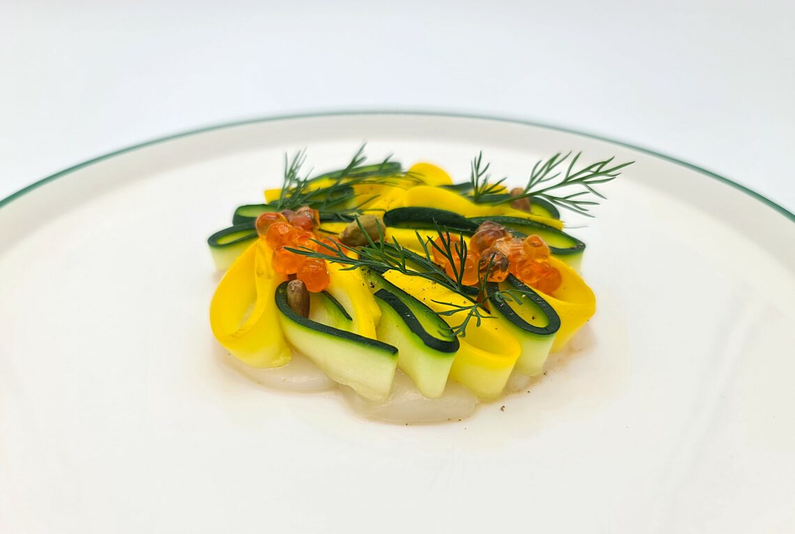 Pour l’entrée, j’ai fait un carpaccio de Saint-Jacques avec des courgettes blanchies, des œufs de saumon et de l’aneth. Le tout assaisonné de citron et de diverses épices.