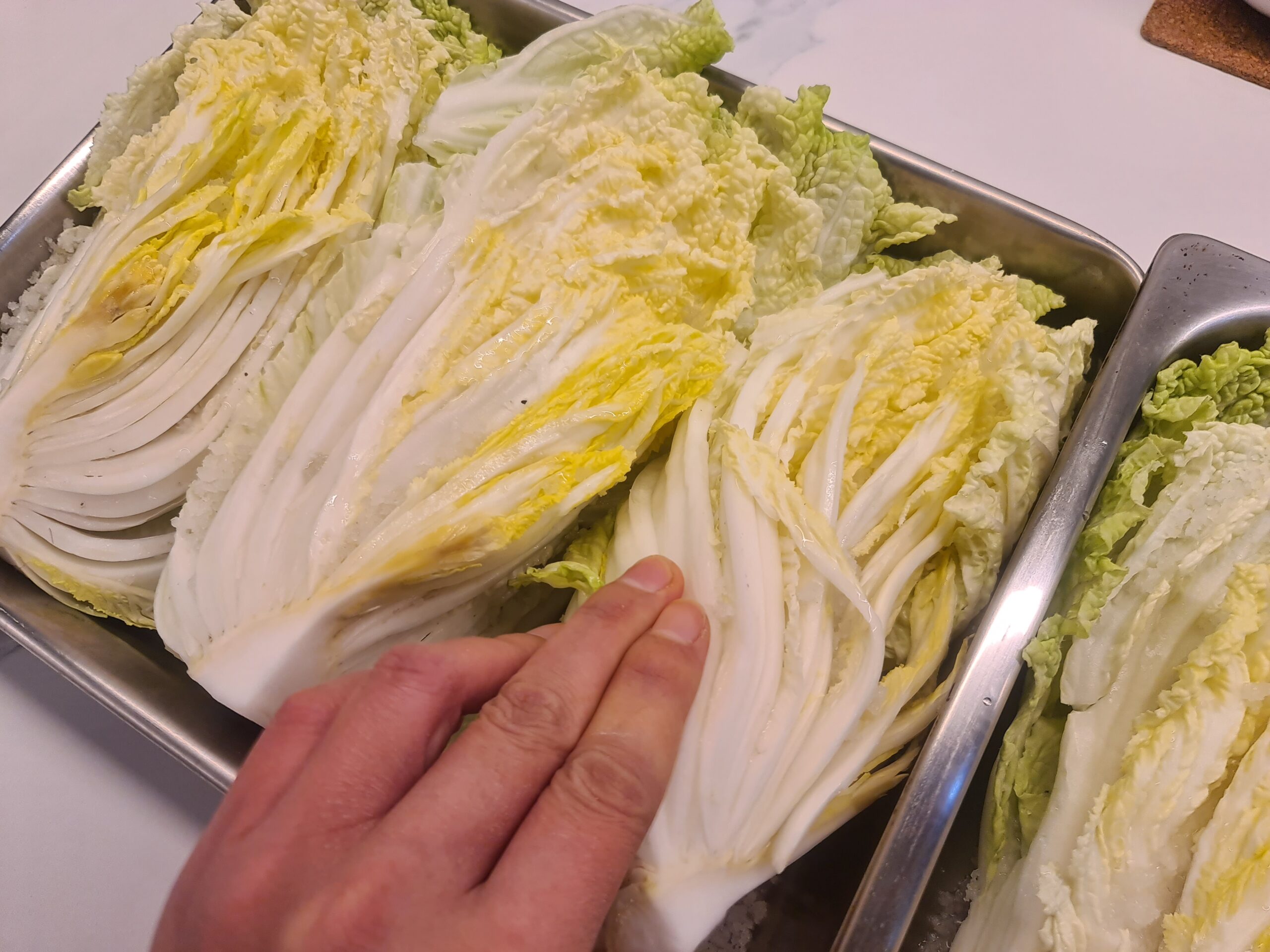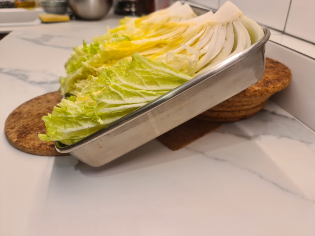 Mettez du sel entre chaque feuille du chou, et stockez votre chou dans une grande bassine – ou autre -, pour que le chou dégorge. Retournez le chou toutes les 30 minutes pendant 2 heures pour que le sel aille partout et que le chou dégorge bien de partout.