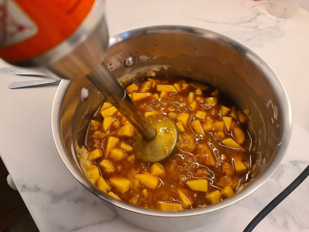 Ajoutez la poudre de gingembre ou le gingembre frais mixé, le navet long en morceaux, la pomme ou le nashi et les crevettes. Mixez bien.