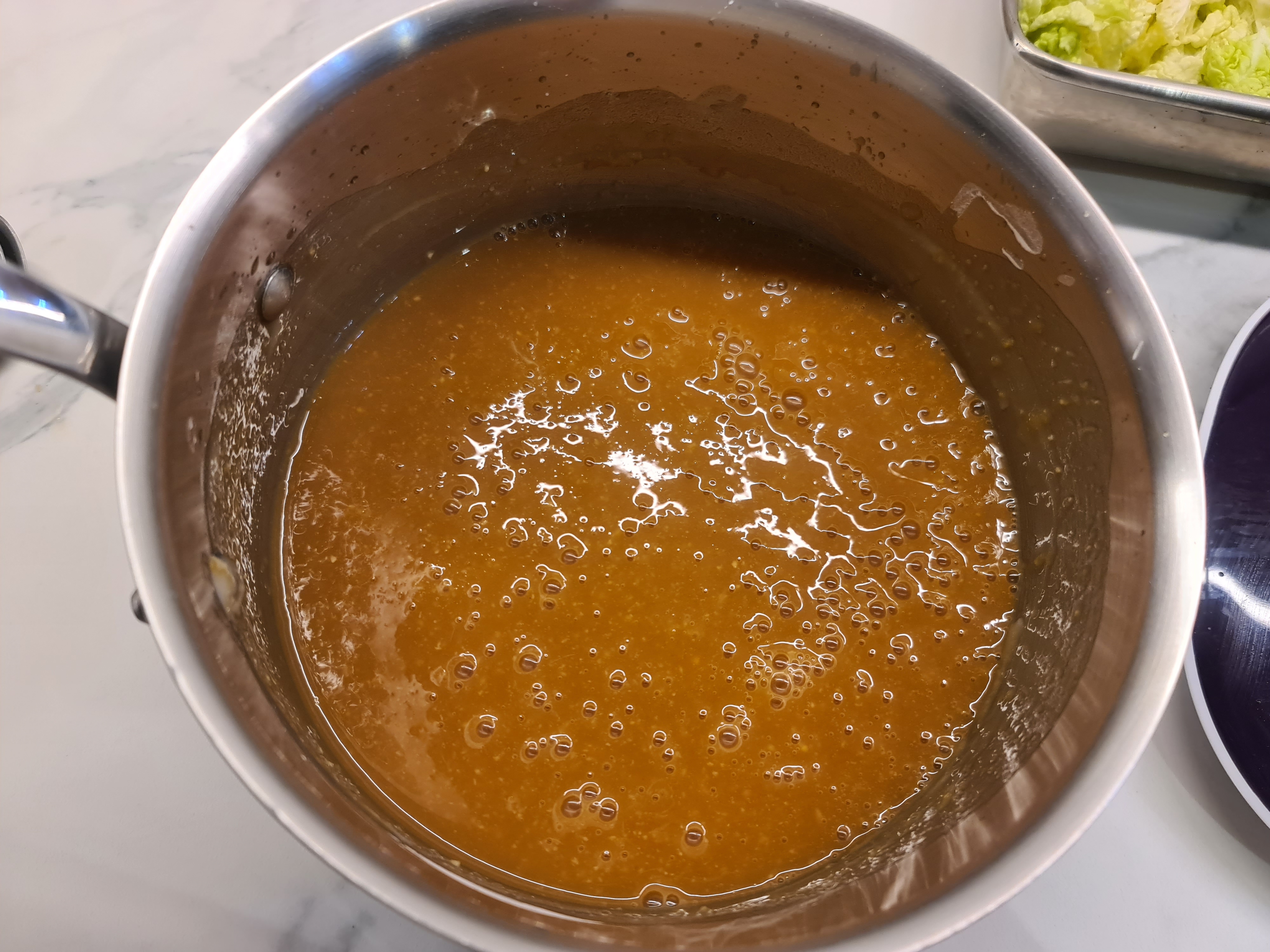 Ajoutez le sucre roux, la sauce soja, le vinaigre de pomme, la sauce poisson, la sauce d’huitre, mélangez bien.