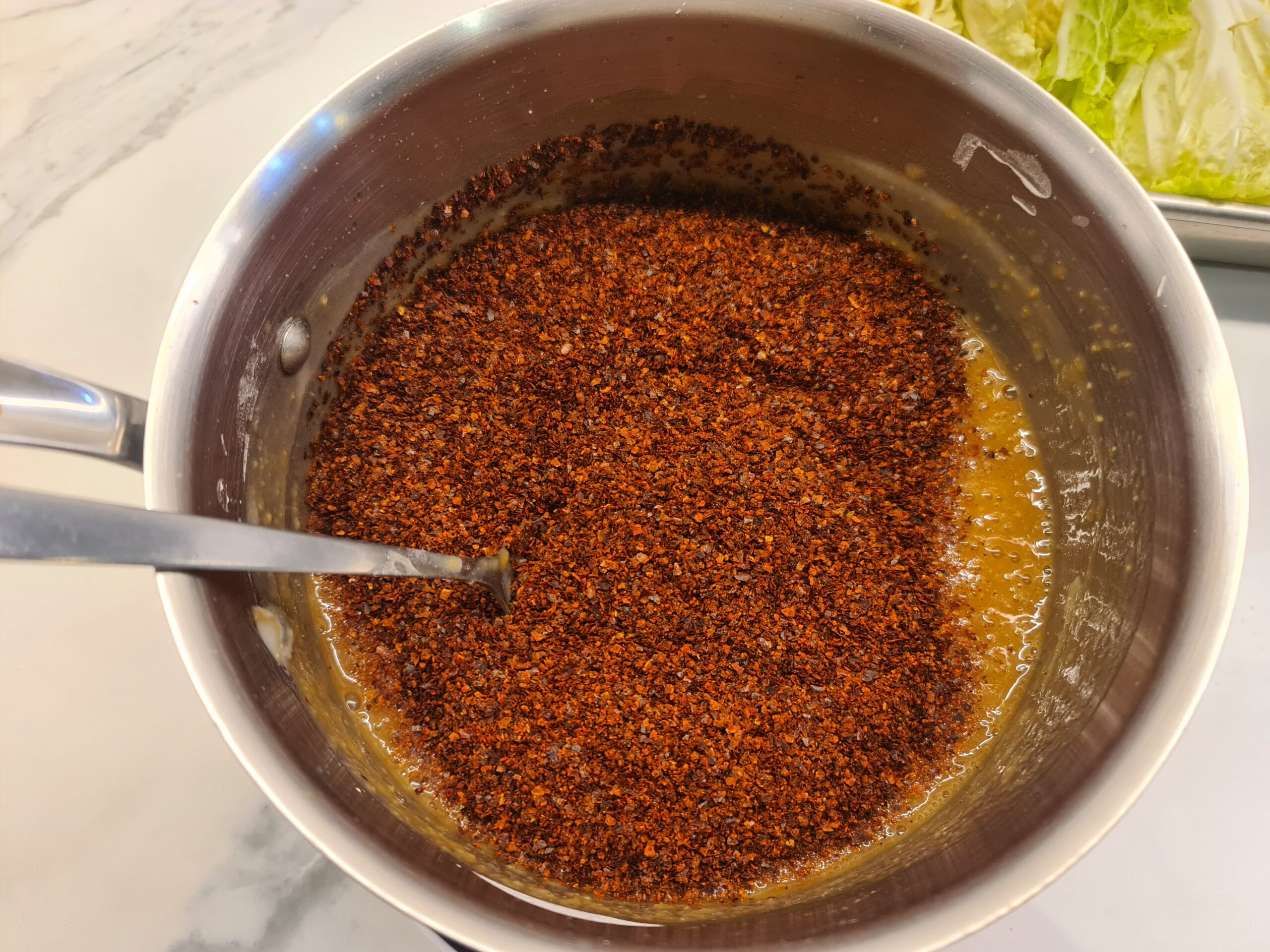 Ajoutez le gochugaru, les flocons de piments. Mélangez bien.