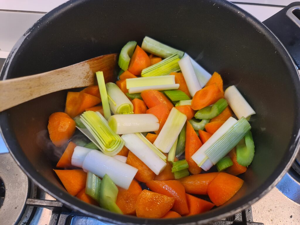Dans une marmite, faites fondre du beurre et faites revenir les carottes, le céleri et les poireaux
