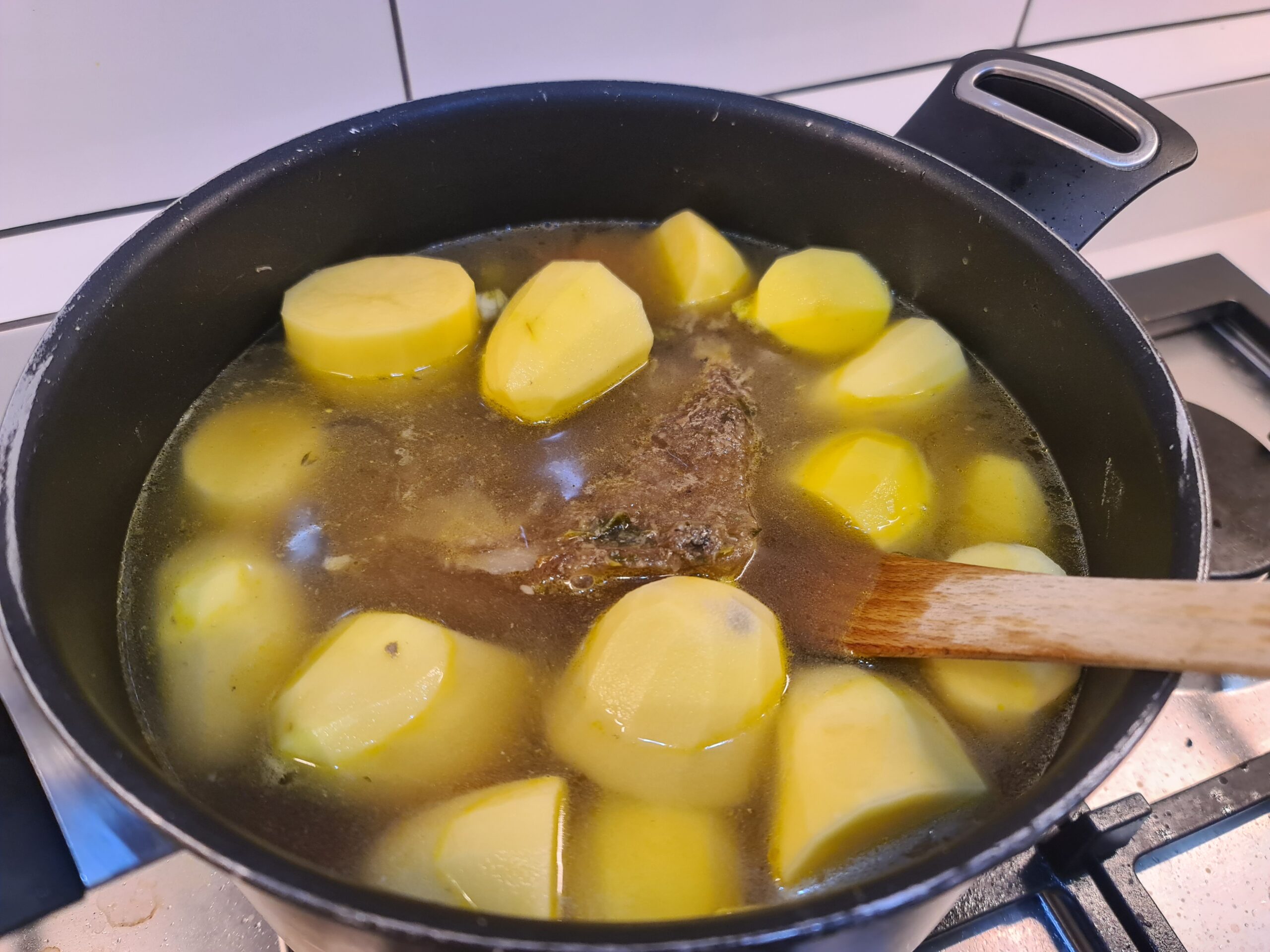 Ajoutez le bouillon, le poulet, les pommes de terre, salez, poivrez, puis portez à ébullition