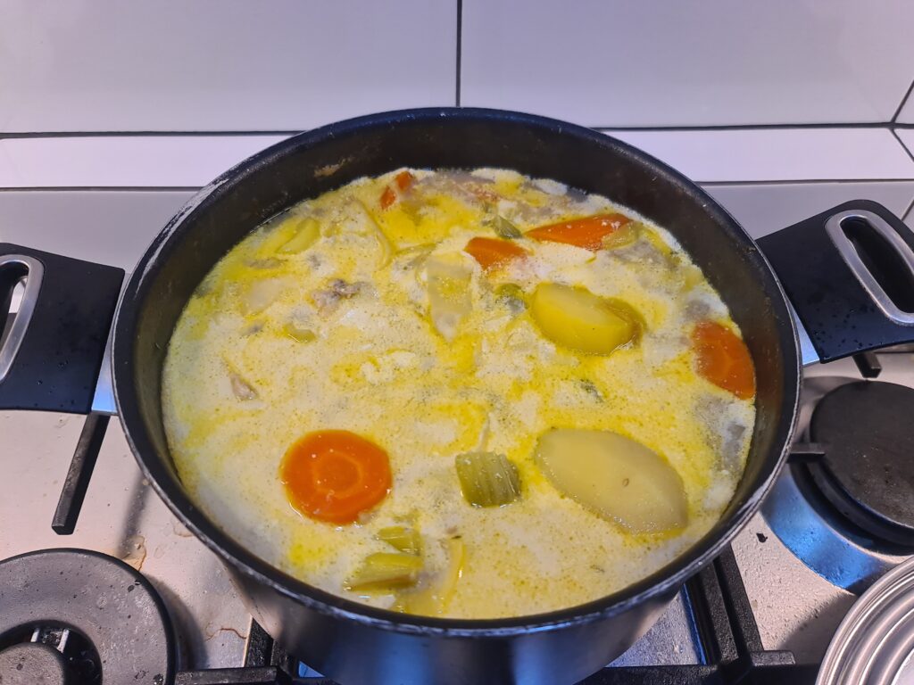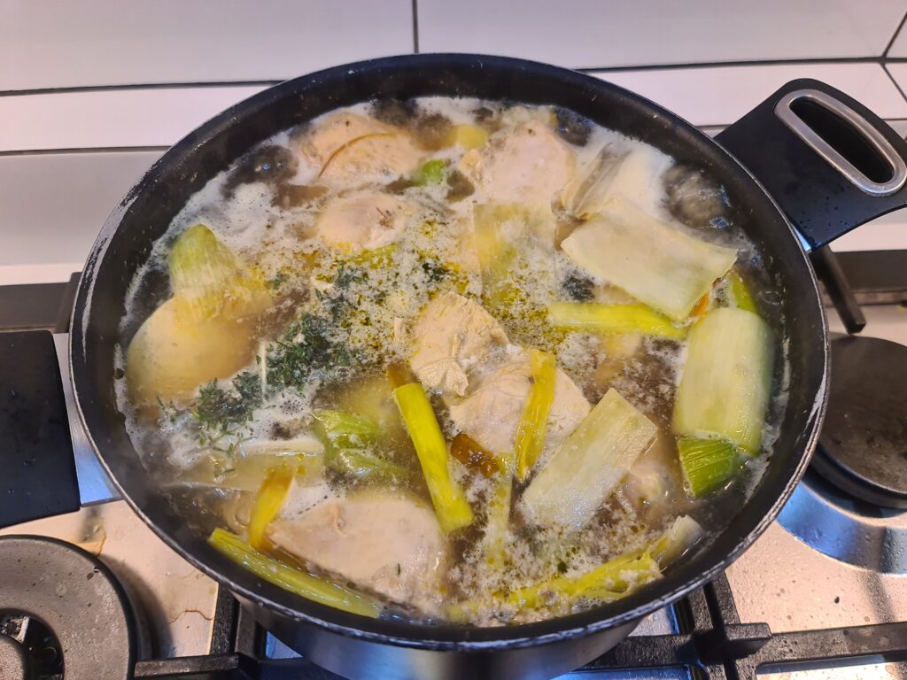 Il est possible de faire ce plat belge avec différentes protéines : poulet ou poisson. Je fais cette recette avec du poulet. C’est la recette de ma femme, qui traine sur une feuille A4, difficile à déchiffrer, que nous mettons sur le blog afin d’en faciliter son accès et sa lecture. De plus, nous pouvons y ajouter des photos. Comme nous sommes 4, nous le faisons avec 4 blancs de poulet. Cela dit, nous pourrions découper un poulet entier.